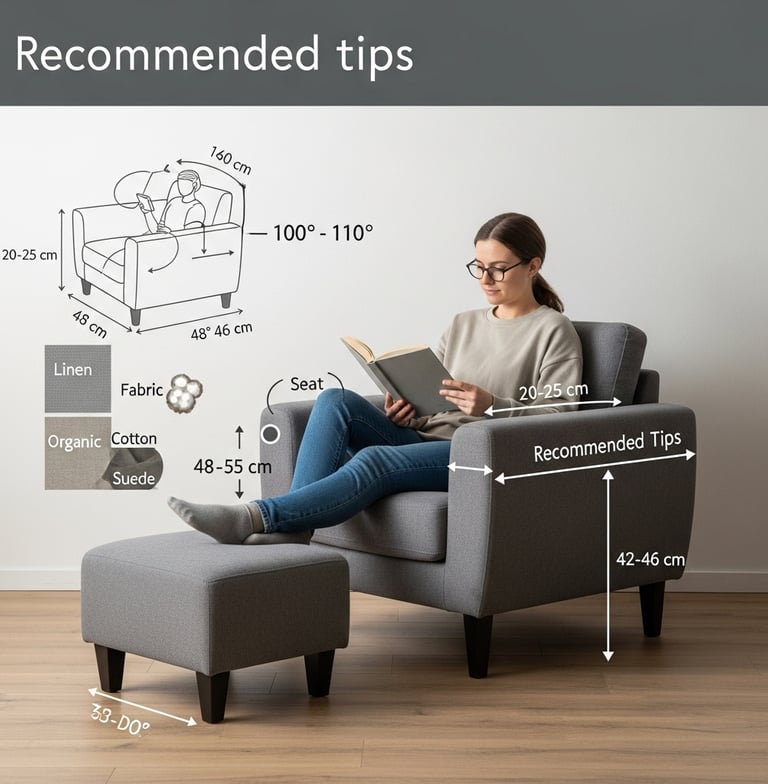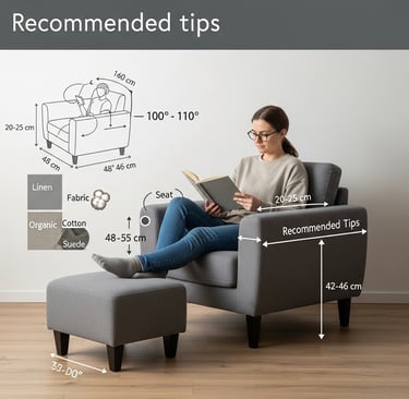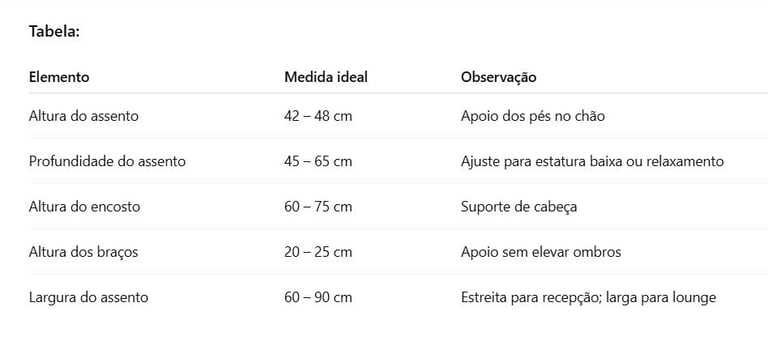 A poltrona de leitura prioriza suporte lombar e postura confortável para períodos prolongados. Deve permitir que os pés toquem o chão e que a coluna mantenha curvatura natural.